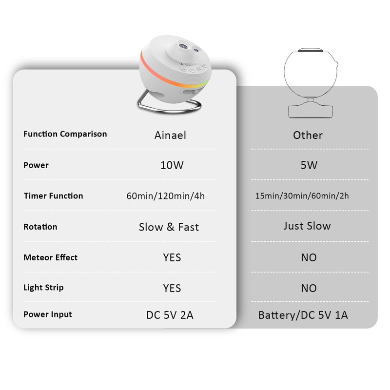- *Package Contents & Warranty: Includes 1* Meteor and Galaxy Projector, 1* Glass Panel, 1* USB-C Charging Cable, 1* User Manual; We still offer every customer 12 months warranty for worry-free use. Ainael starlight projector creates immersive starry sky scene is perfect for anyone looking for star projector or home planetarium.