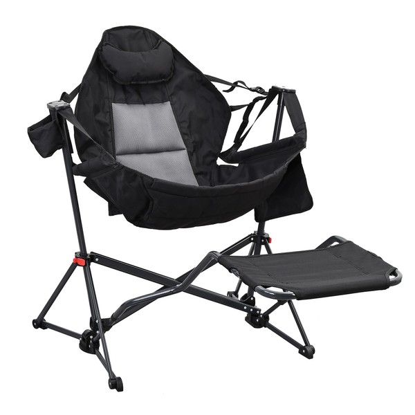 Ainfox Hammock Camping Chair with Footrest, Foldable Portable Rocking Chairs for Adults Outside Swinging Camp with Cup Holder Pillow for Outdoor Patio Poolside (Black)