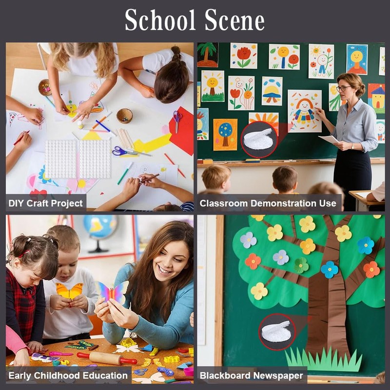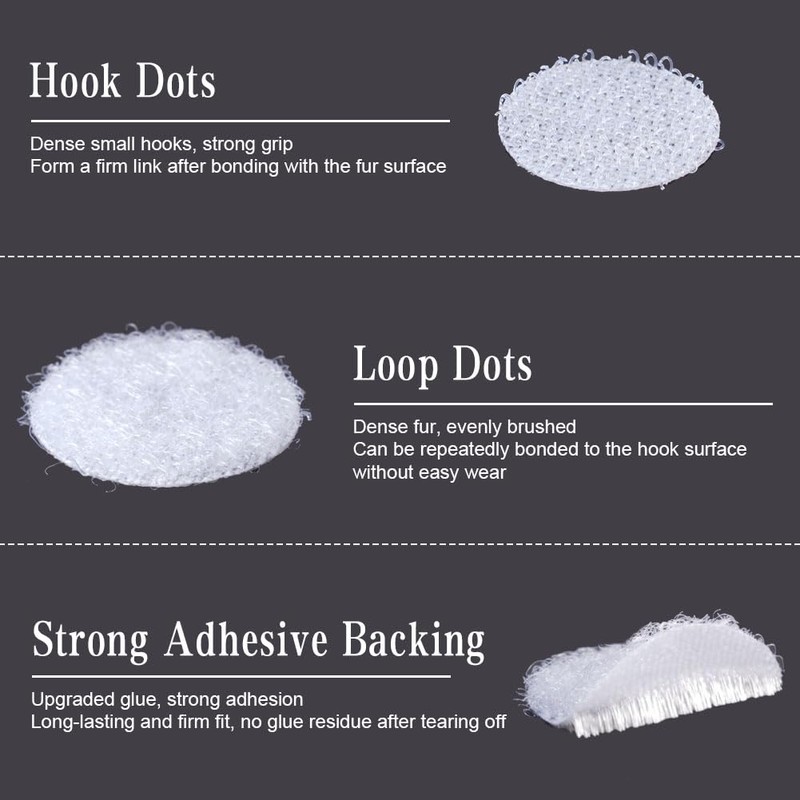 - 【WIDELY USED】This self-adhesive white double-sided dot sticker has a hook side (hard hair) on one side and a velvet side (soft hair) on the other side. Two dots can be firmly bonded when paired. Suitable for most smooth surfaces such as plastic, glass, metal, paper, wood, etc., very suitable for DIY, children's toys, crafts, folders, posters, etc.