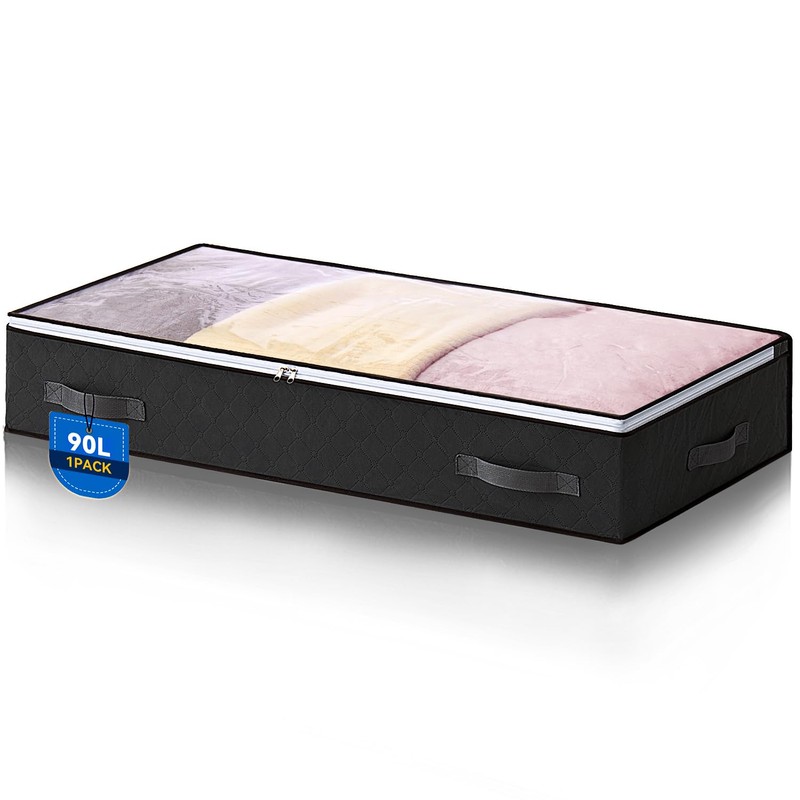 AIOR 1 x 90 L Underbed Storage Bag with Viewing Window, Foldable Underbed Storage Bag, Clothes Storage, Blanket Organiser, Storage Container, 100 x 50 x 18 cm (Black)