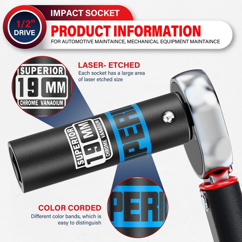 - Each socket is laser etched with size and color coded, making it easy to identify and select the required socket size to simplify your workflow and increase your work efficiency