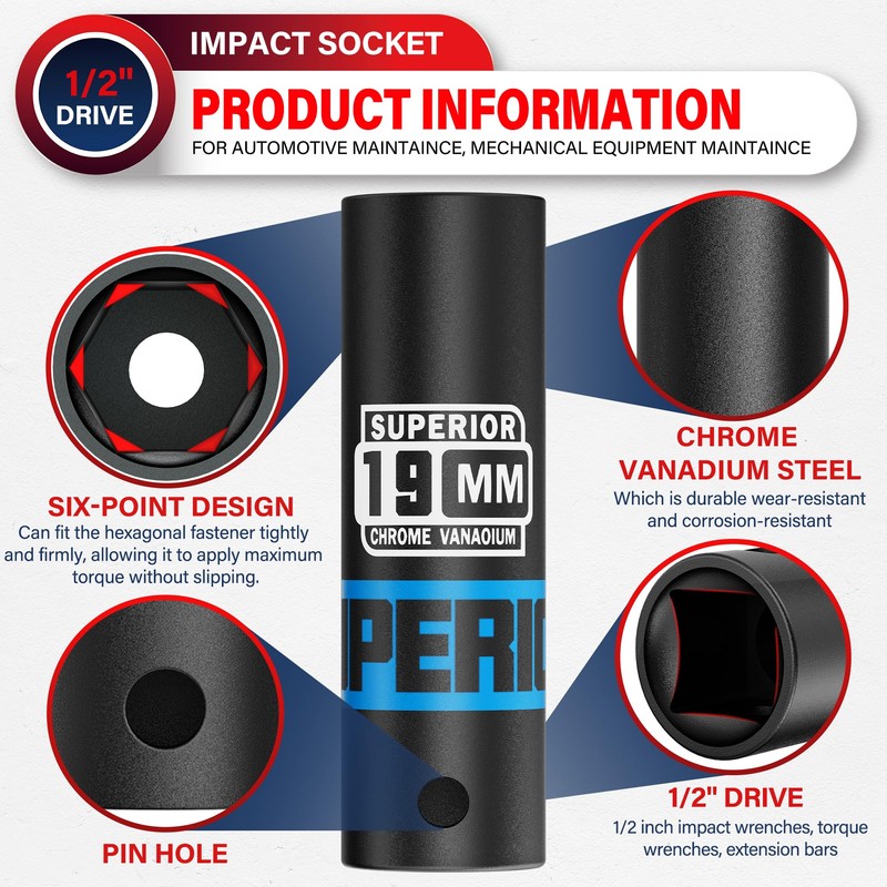 Aiourx 1/2" Drive Impact Socket, 19 mm Deep Socket, Metric, 6 Point, CR-V, for Car Repair, Loosen The Fastening Nut