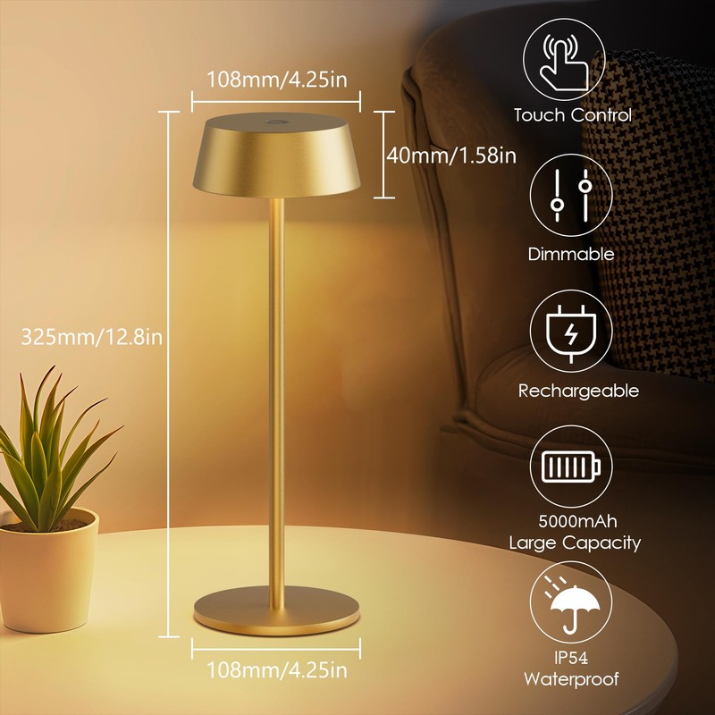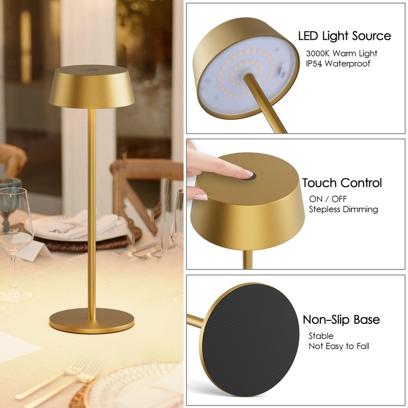 - ►「IP54 Waterproof」 The surface of this battery operated table lamp is fully enclosed design, the charging socket is under the lampshade, with a part plugging the charging port when the lamp is not charging, to avoid water flow into the charging socket. The high quality aluminum does not rust after being exposed to rain.