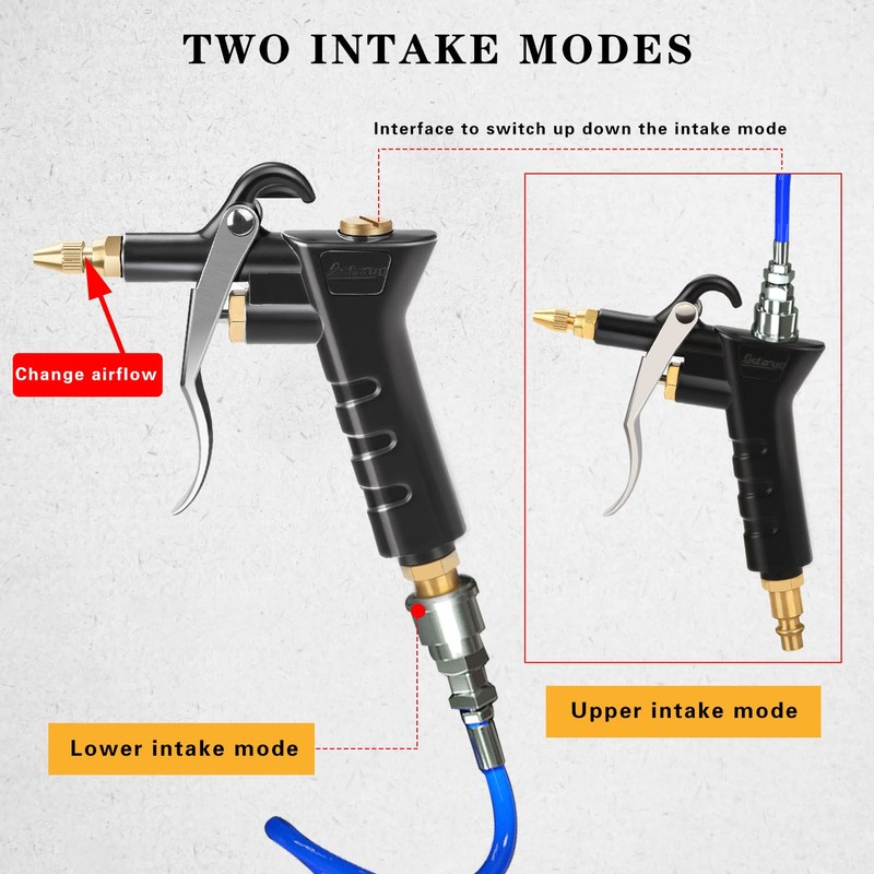 • ★FUNCTION - High-speed and narrow airflow sprayed by slotted nozzles can be injected into the the occasion difficult cleaned up such as deep, blind or narrow holes. The airflow speed and amount can be changed by adjusting the outlet nozzle of the air blow gun