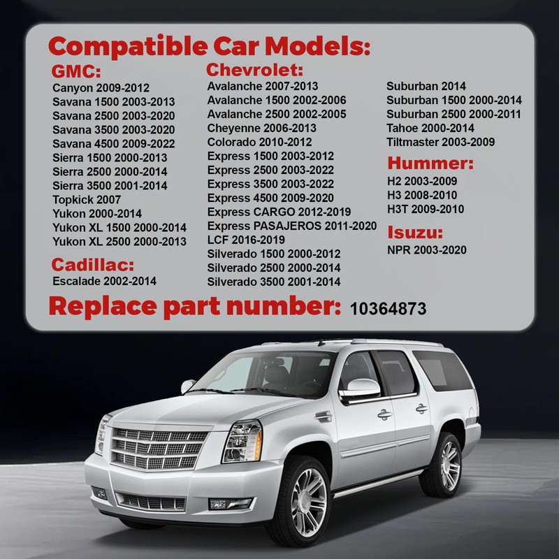 - Part Number: 15036042, 15068853, 15068854, 1508161, 15081860, 15081861, 15100337, 15100338 15106396, 15169964, 15169965, 15707611, 77362, 77363, 77377, 78362, 77363, 78377, 78376, GG362, GH362, GG377, GH377, 10364873, 10366545.