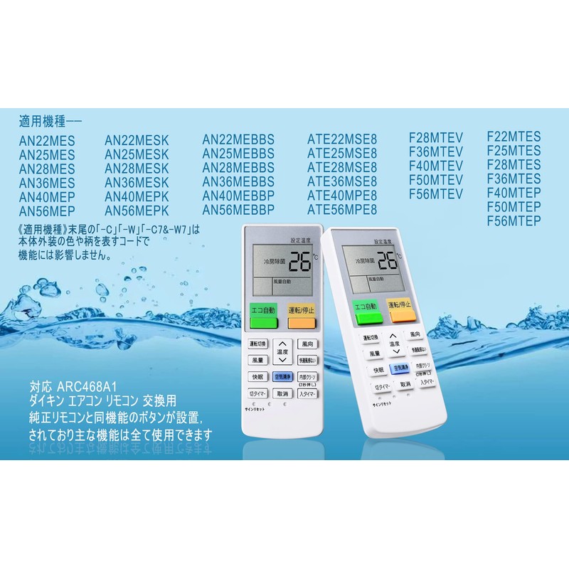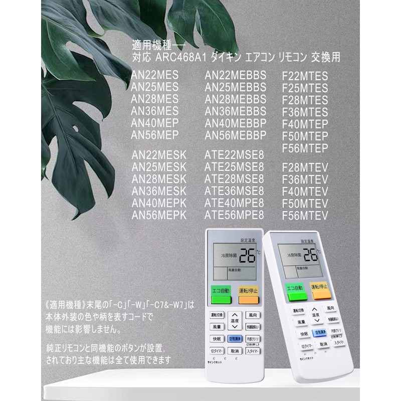 - This Daikin Remote Control ARC468A1 "Remote Control", Compatible Remote Control Model Number: ARC468A1, Compatible Models: AN25MES AN28MES AN36MES AN40MEP AN56MEP AN22MESK AN25MESK AN28MESK AN36MESK AN40MEPK AN56MEPK AN2MEBBS 5MEBBS AN 28MEBBS AN36MEBBS AN40MEBBP AN56MEBBP ATE22MSE8 ATE25MSE8 ATE28MSE8 ATE36MSE8 ATE40MPE8 ATE56MPE8 F22MTES F25MTES F28MTES F36MTES F36MTES F36MTES F36MTES F40MTE P F50MTEP F56MTEP F28MTEV F36MTEV F40MTEV F50MTEV F56MTEV *Compatible models: The tail "C", -W", "-W5, and -W7" is the exterior color and pattern of the main unit, and does not affect the function, so it is abbreviated from the model number