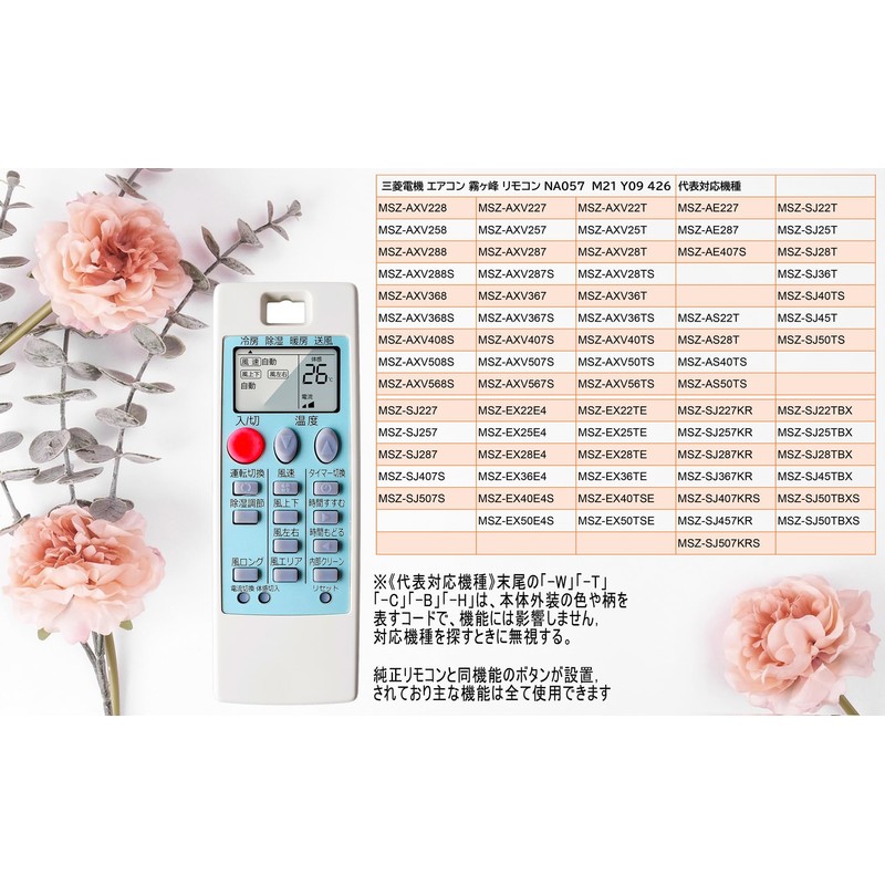 • This Air Conditioner Mitsubishi Kirigabine Remote Control Universal Remote Control Compatible Remote Control Model Numbers: NA057 / M21Y09426, Compatible Models: MSZ-AXV228, MSZ-AXV258, MSZ-AXV288, MSZ-AXV288S, MSZ-AXV368MSZ-AXV368MSZ-AXV368S AXV408 S MSZ-AXV508S MSZ-AXV568S MSZ-AXV227 MSZ-AXV257 MSZ-AXV287 MSZ-AXV287S MSZ-AXV367 MSZ-AXV367S MSZ-AXV407S MSZ-AXV507S MSZ-AXV567S MSZ-AXV2V2 T MSZ-AXV For 25T MSZ-AXV28T MSZ-AXV28TS and other compatible air conditioner models, please see the "Representative Compatibility" chart. [Representative compatible models] The tail "-W", "-T", "-C", "-B", and -H" is a code that represents the color and pattern of the main body and does not affect the functionality. Ignore when searching for the compatible model