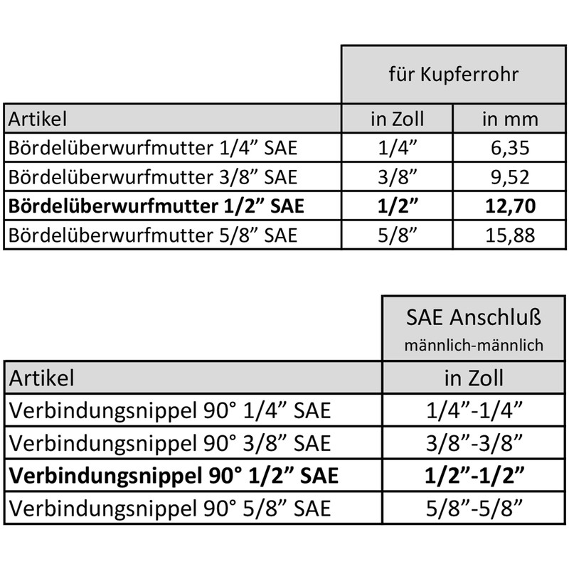 Connection nipple set 90° for 1/2 inch SAE copper pipes.