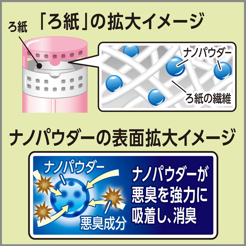 - 【ナノパウダー※配合】 すばやく強力に空間を消臭。※ナノレベルの孔(あな)を持つ、悪臭を吸着する消臭剤。