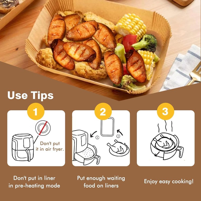 - Tips & Service - 1. Air fryer preheating can not put air fryer paper. 2. use food should not be placed too little, to avoid because of light weight, can not press the paper tray, hot air blow the paper tray to the heating duct element to cause problems. If you have any concerns or questions, please feel free to contact us. We provide 7 * 24-hour customer service, full refund or replacement is available if you are not satisfied with this Air Fryer Liners, Please be assured of the purchase.