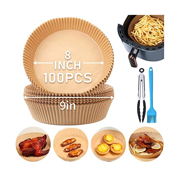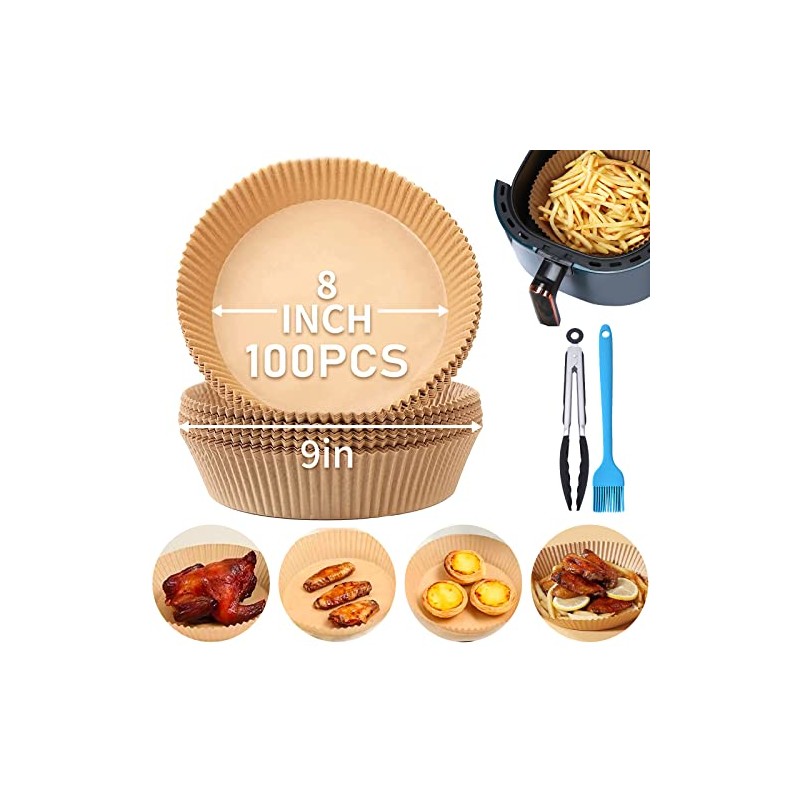 - Packaging: Airfryer parchment liners are round bowl shaped, 2 INCH (4.5cm) high, 8 INCH (20cm) lower diameter and 9 INCH (23cm) upper diameter. You will receive 100 air fryer disposable paper liners, a sauce brush and a cooking tongs. Enough for your everyday cooking, baking and changing needs.
