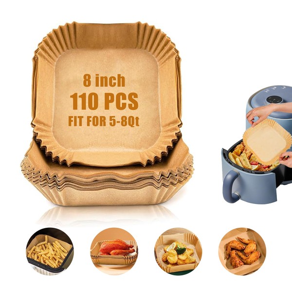 Air Fryer Paper Liners, 110 PCS Non stick Oil Resistant Air Fryer Parchment, 8 Inch Disposable Food Grade Free Of Bleach Square Parchment Baking Paper