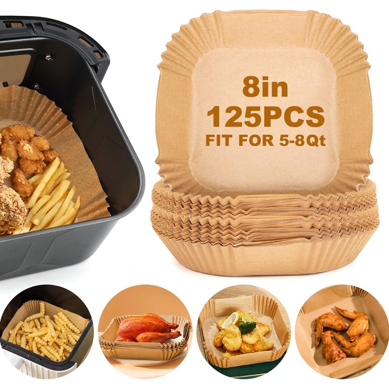 Air Fryer Paper Liners,125PCS Air Fryer Disposable Liners for 5-8QT Air fryer,8inch Square Non-stick Parchment Paper and Oil Proof for Easy Cleanup