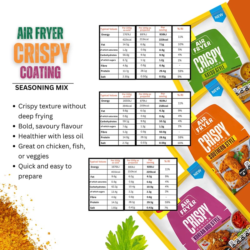 - Crispy Coating Southern Fried Chicken Style (70g) – Packed with bold, comforting flavour, this Southern-style chicken fry mix, brings the taste of classic southern fried chicken to your air fryer. Enjoy a satisfying crunch and savoury finish—perfect for anyone craving traditional fried chicken coating without the oil.