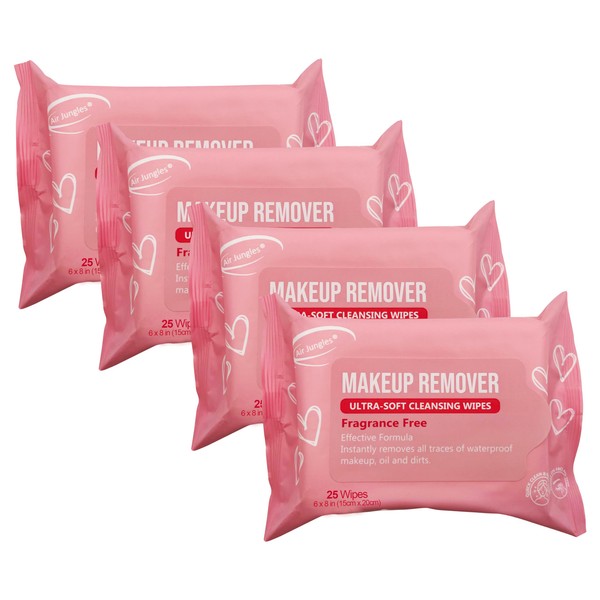 Air Jungles Makeup Remover Wipes 25 Count (Pack of 4), Fragrance-Free, Gentle Removes Makeup and Oil, Soft Cleansing Wipes, Alcohol Free, Large 6" x 8" Wipe Size