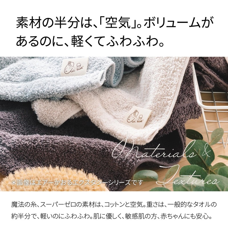 - (Volume, yet Lightweight) With a patented technology that creates an air pocket between the yarns, the amount of cotton is used for approximately half the amount of ordinary towels. Lightweight and dries quickly and dries well even when hung in the room. No need to worry about unpleasant smells that dry out
