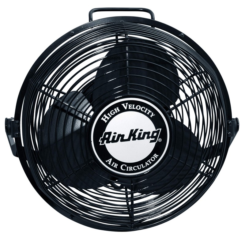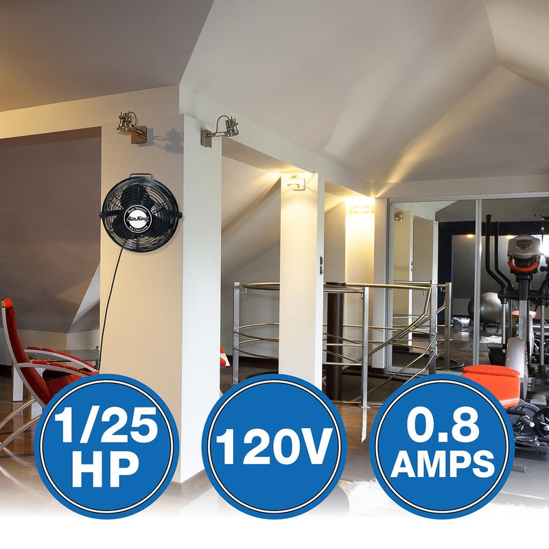 The Air King 9312 Industrial Grade Wall Fan is used to cool and circulate air in industrial or commercial settings including loading docks, warehouses, health clubs and other commercial or industrial spaces. This fan can be monted to a wall, ceiling or I-beam to save floor space. With a powerful motor and steel construction this fan is the perfect cooling and air circulation solution. Air King has added a tough powder coat finish to the blade guard. This unit is tested in accordance with AMCA standard 230-99, meets the requirements of ARRA and is ETL and OSHA compliant. It copmes with a 1 year limited warranty. The fan is equipped with a 3 speed, 1 phase, open motor, sleeve bearing and permanent split capacitor. It moves 1360, 1170 or 1010 cfm on high, medium or low speed. The motor is rated at 0.8, 0.6 and 0.5 amps, 85, 76 and 64 watts and 56, 49 and 42 decibels on hegh, meduim and low speed. The fan head pivots to direct air flow. Features a single bolt mount for fast installation. Secondary support cable included. Other features include rear mounted pull cord, steel handle, steel blade guard and 9 foot, 3 conductor SJT type power cord. About Air KingAir King is an industry leader and offers a full line of industrial grade and commercial grade air circulating solutions. Whether it's for an industrial setting such as a manufacturing plant, warehouse or factory or a commercial setting such as an office, school or hospital, Air King has the perfect solution for you. Air King is known for its powerful motors that last for years.