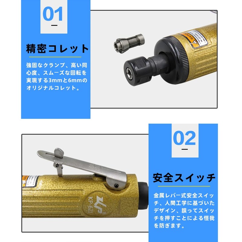 Air Luter, Air Grinder, Safety Switch, High Speed Air Angle Die Grinder, Pneumatic Grinder, 0.1 inch (3 mm), 0.2 inch (6 mm) Chuck, Precision Collet, 25,000 rpm, Speed Control, Ultra High Speed Polishing, Inlet Interface with Wrench (KP-620 (25000 rpm) S