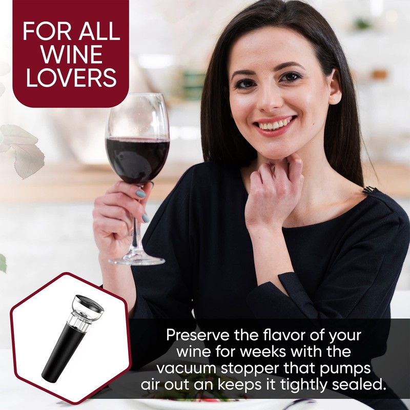 - ● SAVE YOUR LEFTOVER WINE: You can store your leftover wine with the vacuum stopper that’s included. The stopper pumps out air from the bottle to keep it tightly sealed, preserving the flavor of your wine for weeks!