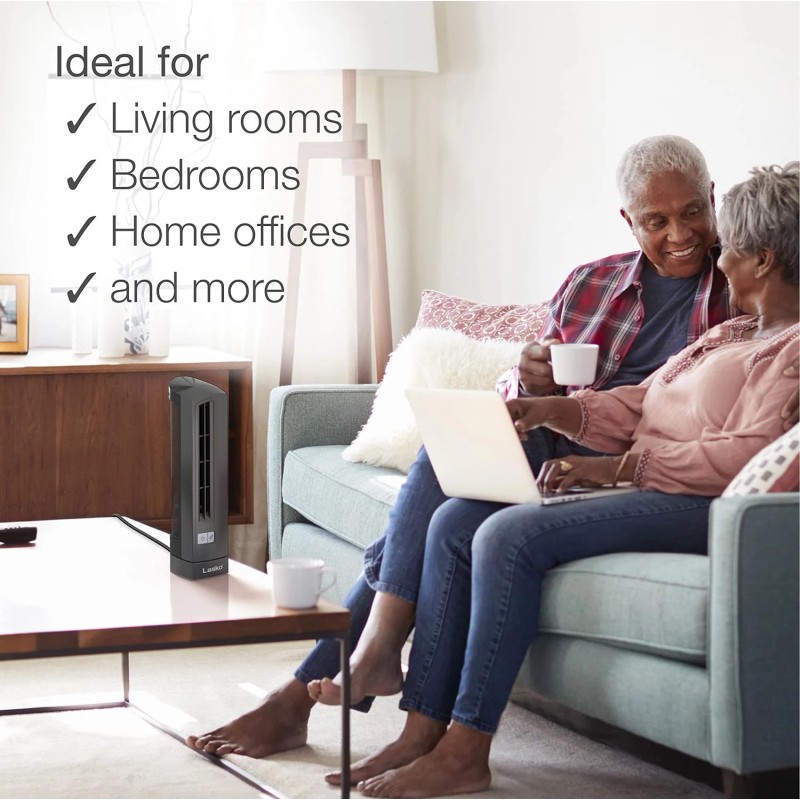 The Lasko Air Stik® oscillating fan features 2 quiet, refreshing speeds. Its ultra-slim design makes it a great addition to the office or anywhere space is at a premium. Quite powerful for its size, this small tower fan has a stylish look that blends well with other decor. This tabletop fan's electronic controls have a beautiful blue LED light illuminating its power and oscillation buttons. Includes Lasko's trusted, fused safety plug and complies with ETL certifications and standards. Comes fully assembled. 1-year limited warranty.