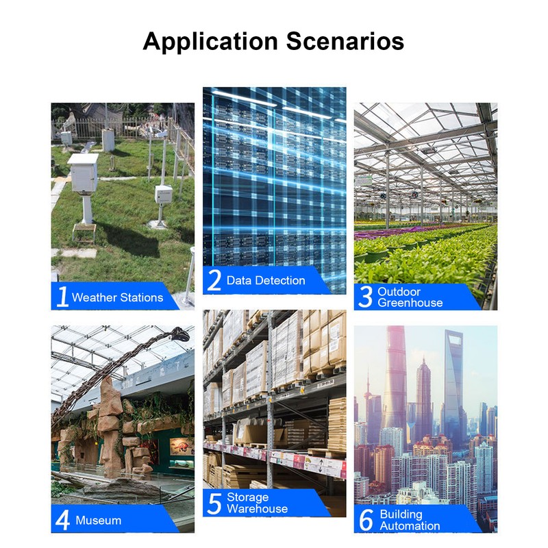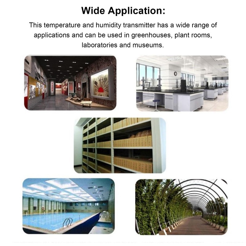 1、Excellent ABS Material: This temperature and humidity transmitter is made of excellent ABS material, which is sturdy and wear resistant, high temperature resistant, and has a long service life. 2、Quick Response: This temperature and humidity transmitter can respond quickly and reflect the measured energy changes in real time, so that the control system can make timely adjustments. 3、High Measurement Accuracy: This temperature and humidity transmitter has high measurement accuracy, with accurate measurement results, and can be used in a variety of situations. 4、Easy Wiring: This temperature and humidity transmitter has four wires, and wiring is very simple, you just need to connect the wires and use it. 5、Wide Application: This temperature and humidity transmitter has a wide range of applications and can be used in greenhouses, plant rooms, laboratories and museums.