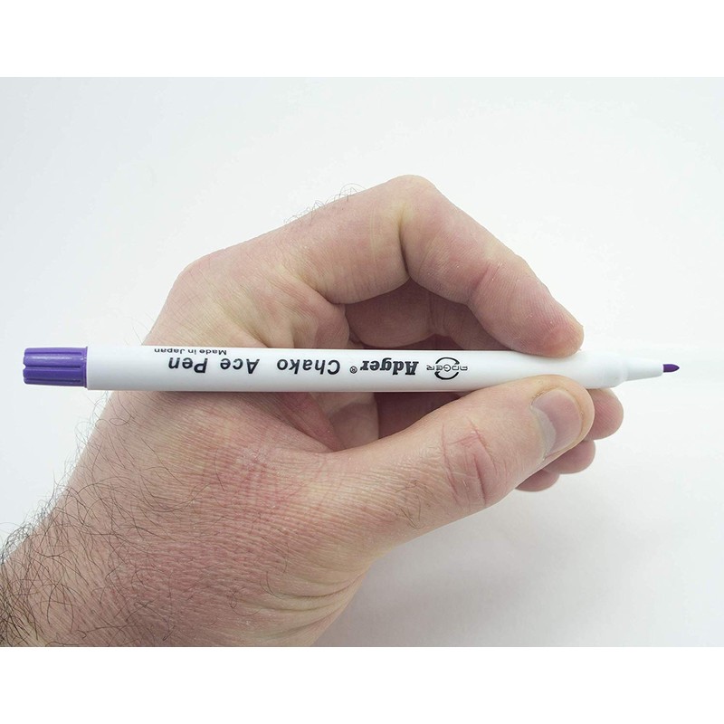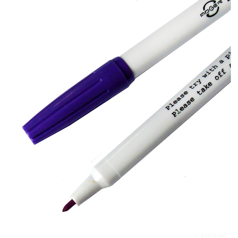 Makes a purple mark. Marks will disappear automatically after certain period of time & can be easily removed with a damp cloth. Instructions: Always test the marker on a spare swatch of your fabric before using making sure marks remove to your satisfaction. On rare occasions certain dyes in material (dyes containing red in particular) may make marks difficult to remove. 1. Mark lightly on wrong side of fabric. 2. To remove markings rub gently with a well moistened cloth. 3. Occasionally the mark will reappear when the fabric dries. Simply repeat the process.