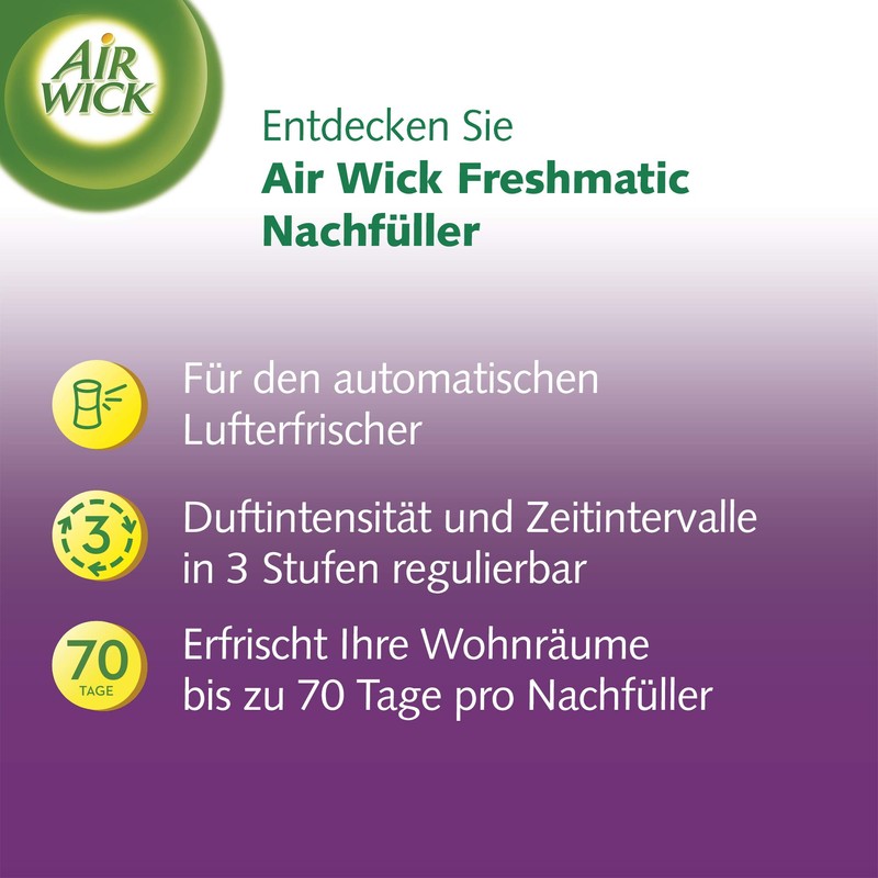- The refreshing fragrance spray is suitable for the Air Wick Freshmatic Max. Battery-operated and with various fragrance intensities, it automatically ensures a good-smelling home.