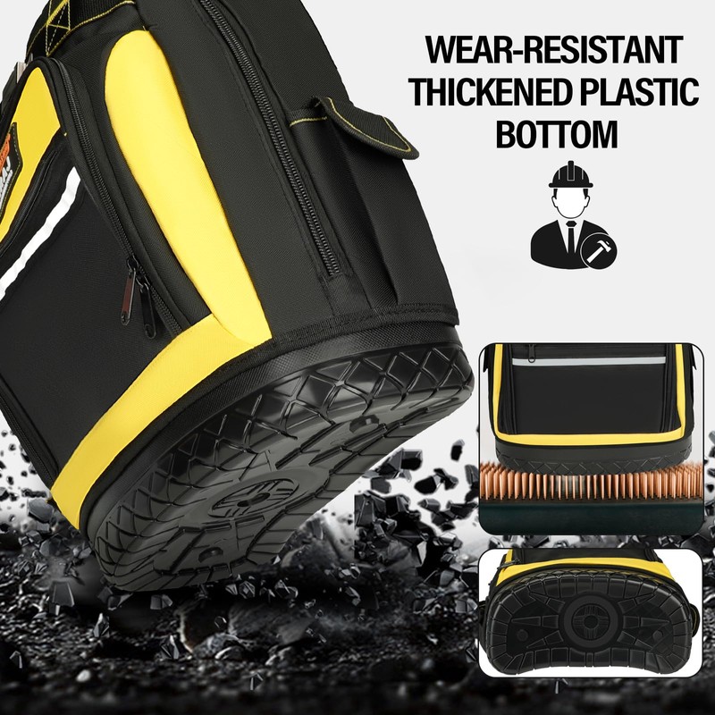 - Molded base: The bottom of the backpack tool bag uses a one-piece PP plastic hard base, which is super wear-resistant and waterproof. And the bottom surface is flat, you can put the tool bag upright on the ground for use. There is no need to worry about water or mud contaminating the tool bag. Just wipe the base with a wet towel and it will be as bright and clean as new.