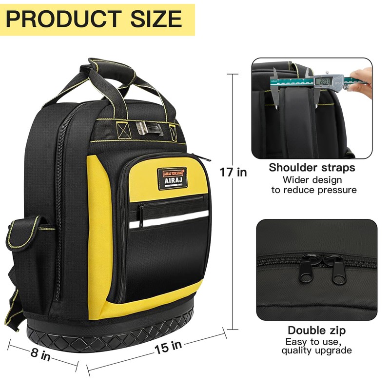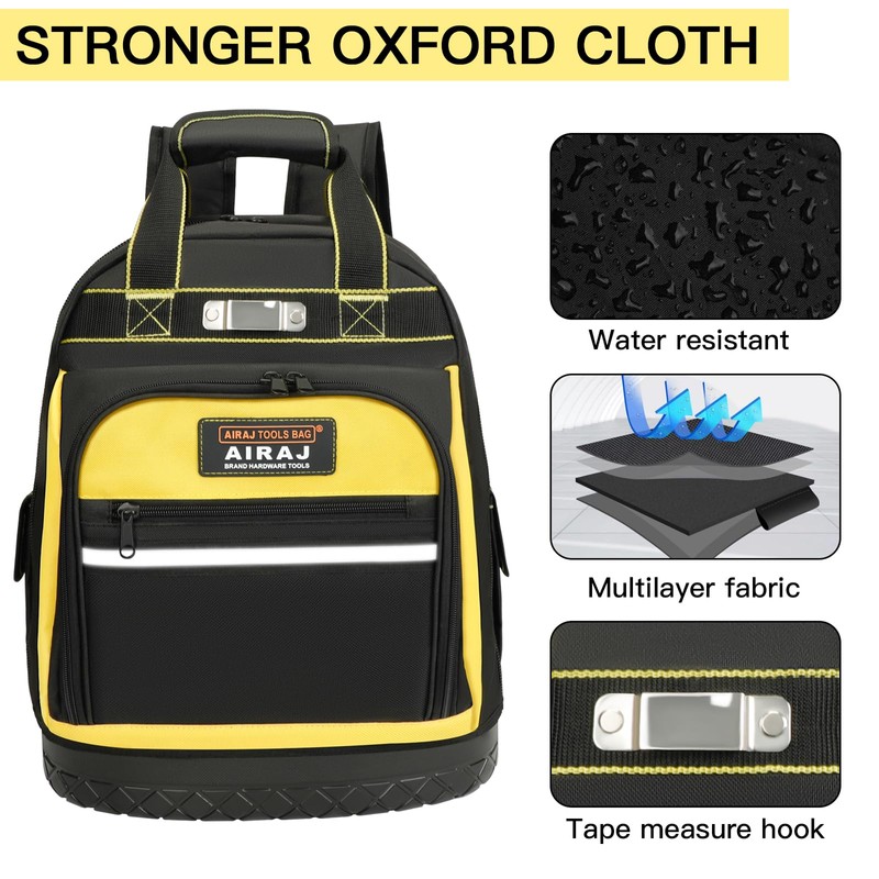 - High-quality fabric: AIRAJ tool backpack is made of high-cost 1680D Oxford cloth. Multi-layer high-density fabric makes the tool backpack tear-resistant and puncture-resistant. And the vulnerable places such as pockets and zippers are carefully reinforced with stitching for a longer service life.