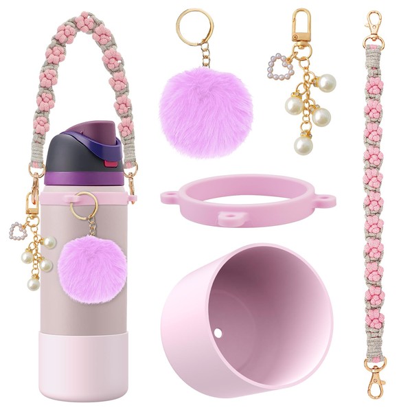 Silicone Boot Set Accessories for Owala Water Bottle 40 oz, Including Handle Strap Protective Sleeve Plush Ball Keychains for FreeSip, Twist, and Flip Stainless Steel Water Bottles(Pink)