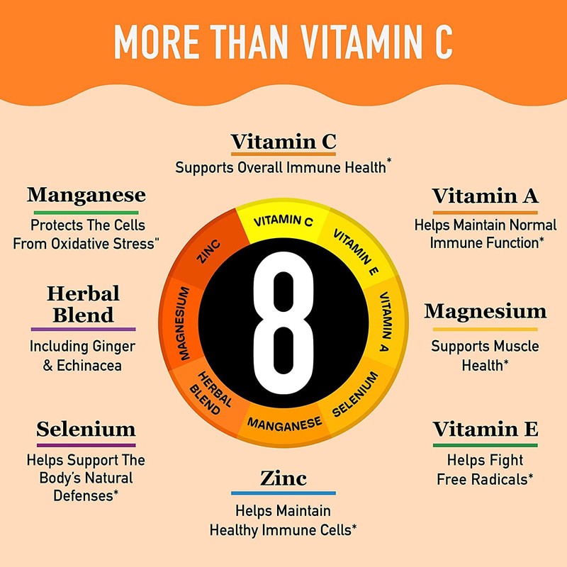 • MORE THAN VITAMIN C: This crafted blend of 13 immune support vitamins, minerals & herbs is an excellent source of Zinc and Selenium.