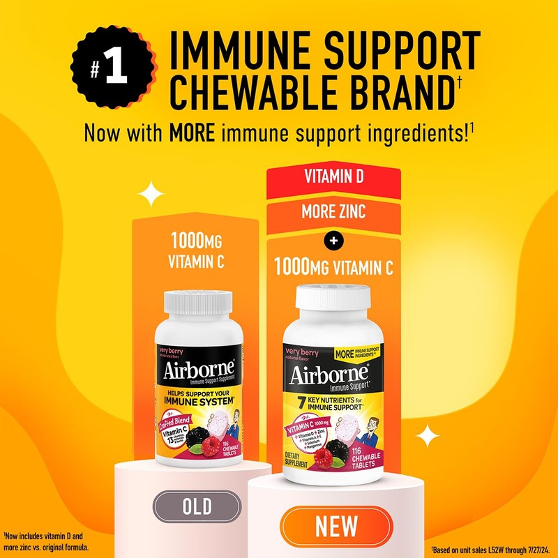 Airborne 1000mg Vitamin C + Zinc Immune Support Supplement Chewable Tablets, Very Berry Flavor with Powerful Antioxidants Vitamins A C & E, 116 Chewable Tablets (2 Pack)