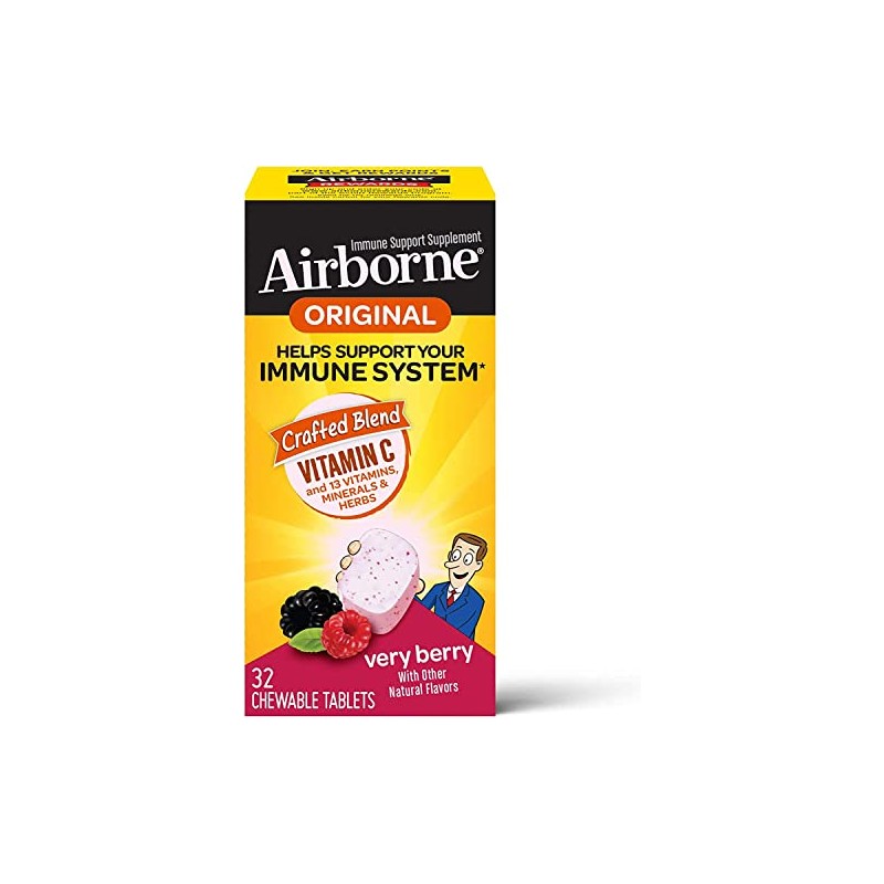 Airborne Chewable Vitamin C 1000mg Immune Support Supplement Tablets - Very Berry Flavor, 32 Count (Pack of 2) (Packaging May Vary)