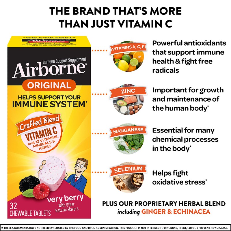 - WHY TO TAKE AIRBORNE: Airborne is the #1 Immune Support Gummy, Effervescent & Chewable Brand. These tablets are easy & convenient for you or your family to take at home or on the go. Vitamin C is among the most important antioxidants in immune health.*