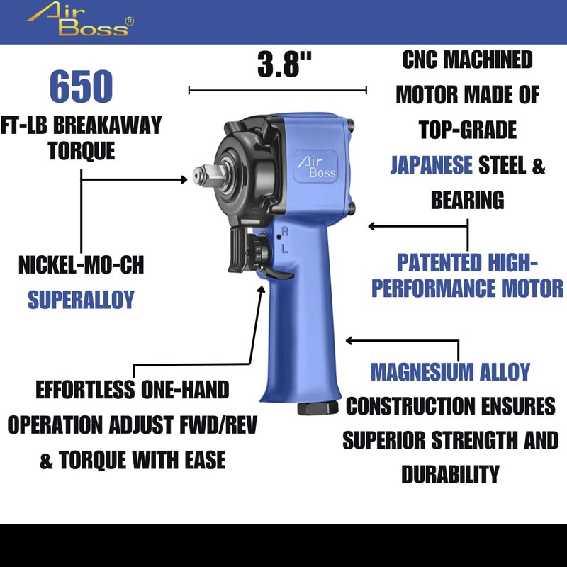 AirBoss AW-90J 1/2" Lightweight Air Impact Wrench – 650 ft-lb Breakaway Torque, Jumbo Hammer Mechanism, Compact Design for Automotive and Industrial Use