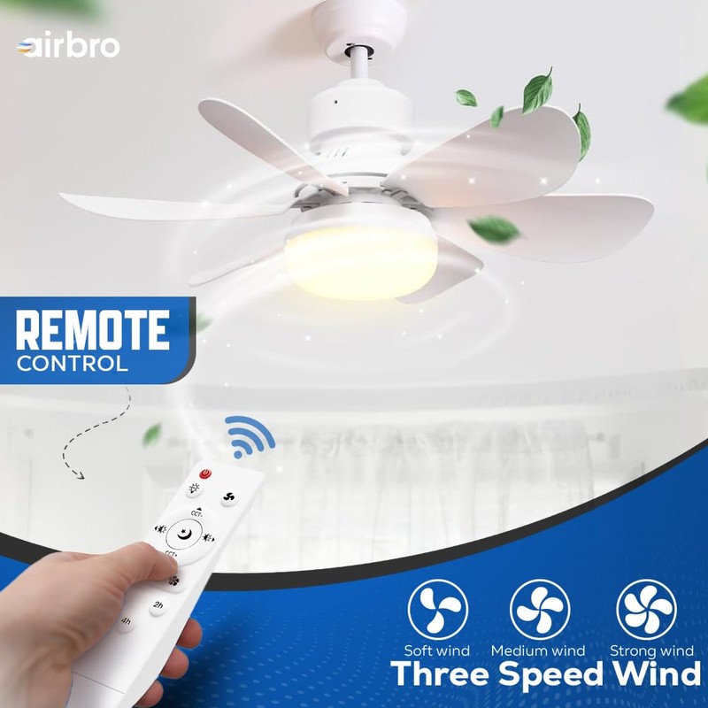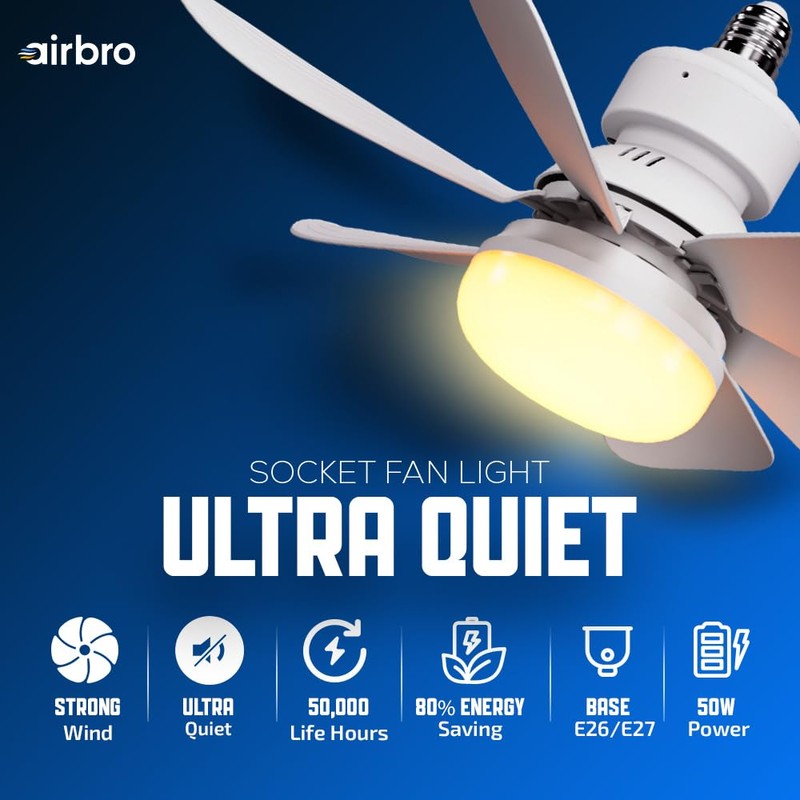 Airbro 21” Socket Fan Light with Remote Control – Quiet 3-Speed Ceiling Fan Light, Adjustable Brightness, 50W, E26/E27 Base, 80% Energy Saving – Socket Extender Included