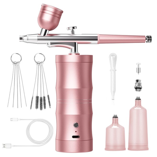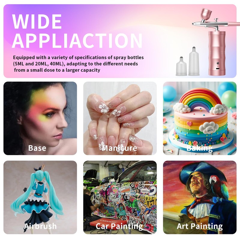 - 【Airbrush Kit with Compressor】With this cordless airbrush kit and its adjustable pressure, you can achieve a variety of effects on any surface. It allows for creating complex fine lines and large area paintings, such as nail art, airbrush makeup, model coloring, hair coloring, cake decoration, graffiti, illustration, and any DIY paint projects.