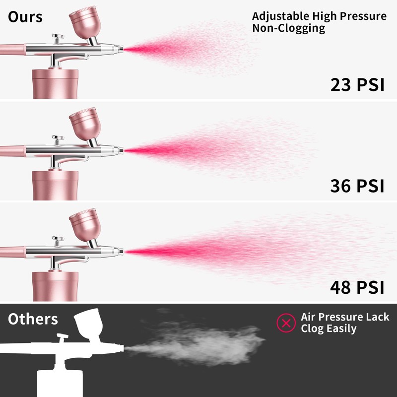 - 【Adjustable 3 Gear Air pressure】Our upgraded airbrush offering 3 adjustable air pressure settings (23psi, 36psi, and 48psi). Achieve your desired effect effortlessly without clogging.Airbrush delivers higher pressure than other airbrushes for effortless, desired nail effects.
