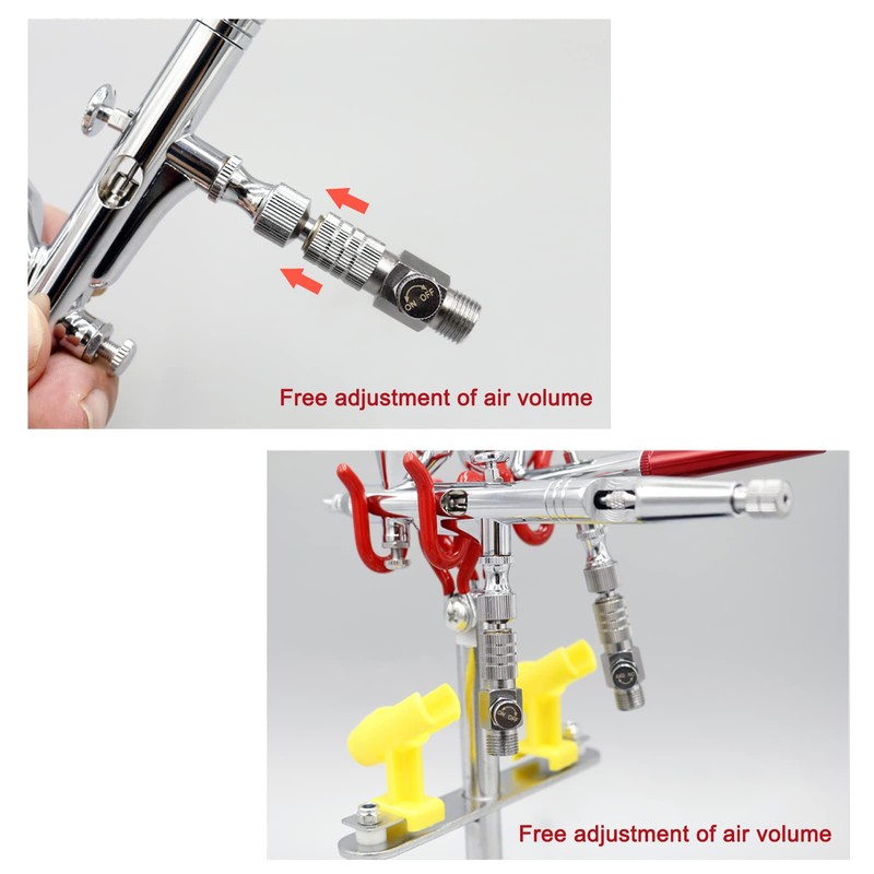 • Adjustment control valve: automatically interrupts the air flow from the hose when it is disconnected. The airflow control valve offers you a hassle-free micro air flow control for your airbrush.