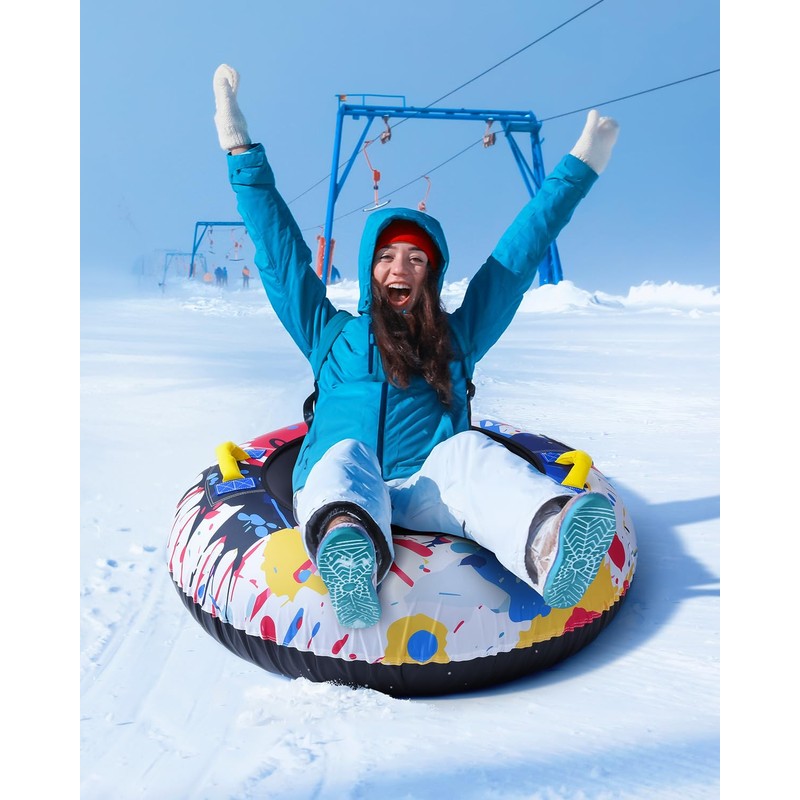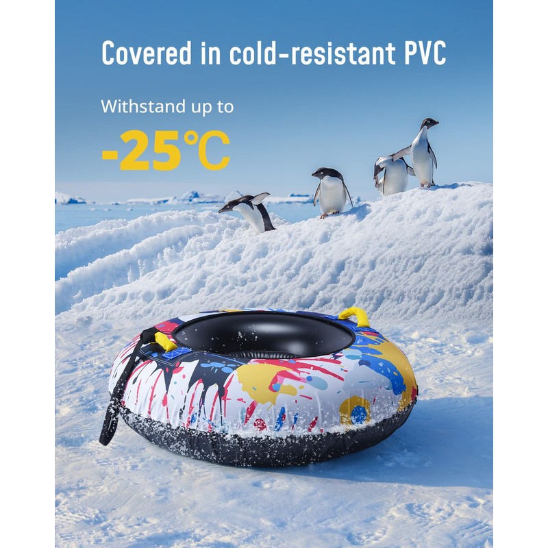 • 【High Quality Material】The inflatable snow tube is made of heavy-duty tear-resistant and cold-resistant PVC material and premium Polyester fabric cover material, which withstand a maximum of -25 degrees. Suitable for most skiing scenarios