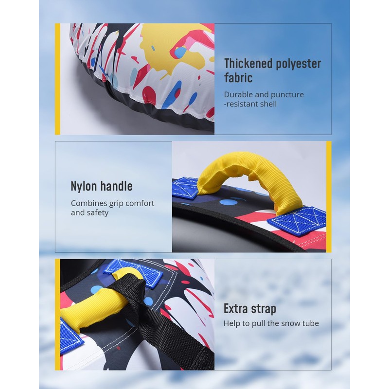 • 【Upgraded Safety Design】Equipped with two sturdy Nylon handles to ensure safety and comfortbility, Shell cover design prevents air leakage and bursting to increase the service life of the snow tube.