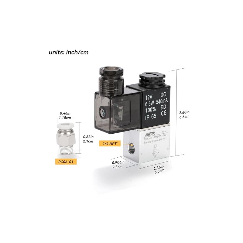 AIRIX 2V025-06 Pneumatic Solenoid Valve DC12V, 2 Way Normally Closed, 1/8" NPT, Pilot-Operated Single Coil, Fast Response Electric Air Valve With Junction Box & Quick Connect Fittings