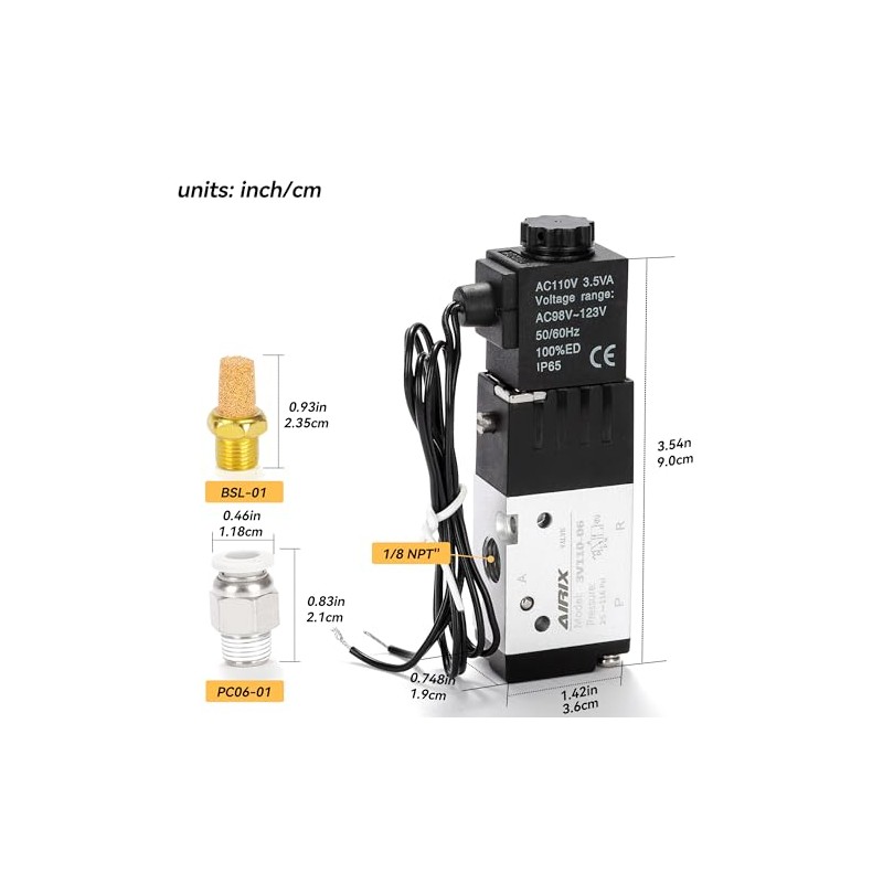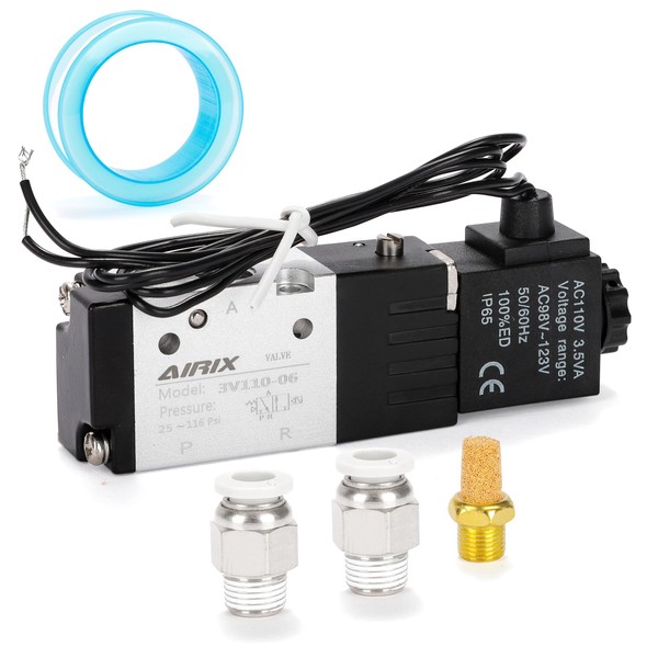 AIRIX 3V110-06 Pneumatic Solenoid Valve AC110V, 2 Position 3 Way, 1/8" NPT, Pilot-Operated Single Coil, Fast Response Electric Air Valve Out Of Line & Quick Connect Fittings