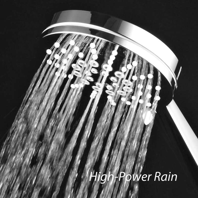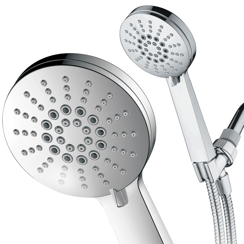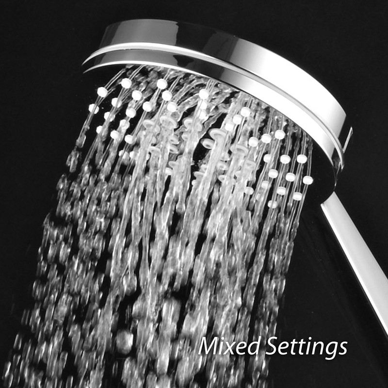 - 6 AMAZING SETTINGS! Power Rain, Pulsating Massage, Mist, Aeration and two Mixed modes for luxurious head-to-toe pampering. WATER-SAVING ON/OFF PAUSE MODE for instant water shut-off if needed. OVERSIZE 4.25" FACE with PrecisionFlo(TM) ANTI-CLOG NOZZLES for extra-wide flow coverage with less clogging and cleaning. ANGLE-ADJUSTABLE OVERHEAD BRACKET for Hands-Free Overhead Shower at desired angle. LATEST DESIGNER STYLE with Clean Bold Look and LUXURY MIRROR-CHROME(TM) FINISH over entire surface.