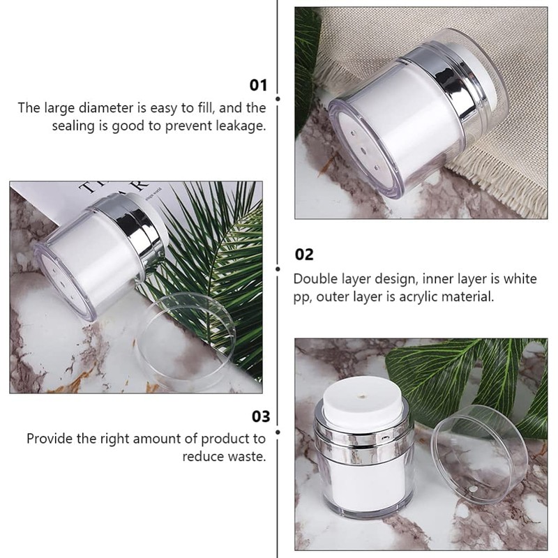 - Vacuum Design: Vacuum pressing design of airless pump jar can maximize the preservation of your skin care products, keep clean and neat, making your skin in a good condition, no worries of doing harm to your skin.
