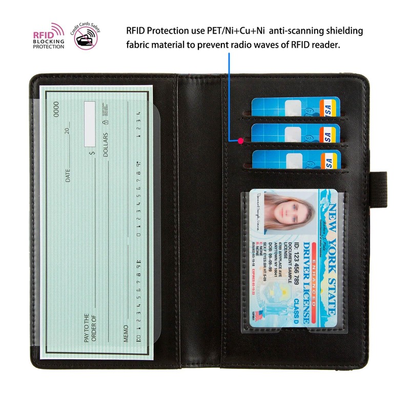 • RFID:SAFETY-PRIVACY-SECURITY: checkbook wallet are Equipped with Advanced RFID SECURE Technology, Protect Your Valuable Data, Block RFID Readers from Scanning Your Credit cards, Debit cards, Banking Information, Smartcards, RFID Driver's Licenses and other RFID Cards.