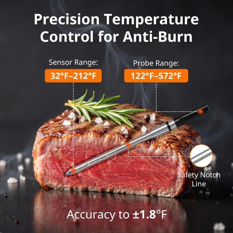 Featuring high-precision 304 stainless steel probes and a wide temperature range from -68°F to 212°F, the AIRMSEN thermometer delivers unmatched accuracy for all types of meats, including beef, chicken, pork, and lamb. It’s designed to perform in any cooking environment, whether it’s a hot oven, a sizzling grill, or an outdoor smoker.