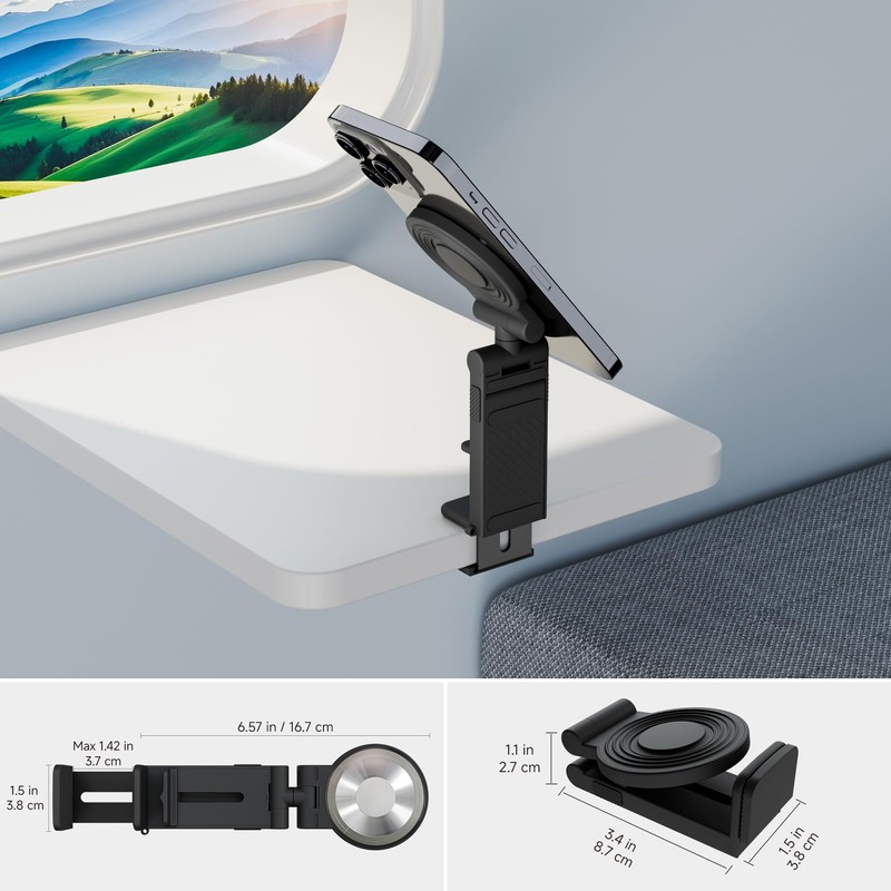 - Travel Essentials:Airplane phone holder has a foldable function and is compact enough to carry around. You can fit it into your backpack or suitcase. You can attach it to a luggage handle, tray table, desktop, chair, shelf, bed, book, power bank, or even use it as a short selfie stick. Phone Mount for Flying is the perfect gift for Birthday, Christmas, Valentine's Day and other holidays!