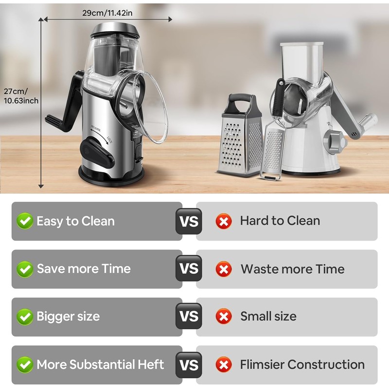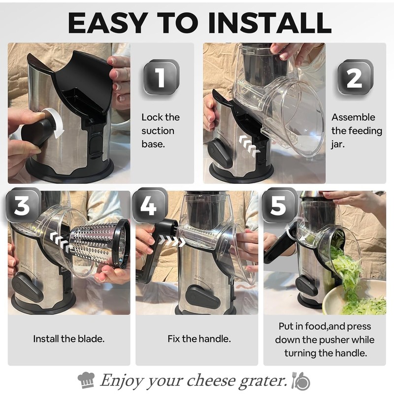 • Safe Innovation:Rotary grater has suction base for stability. Its design keeps hands away from blades and prevents clogging.