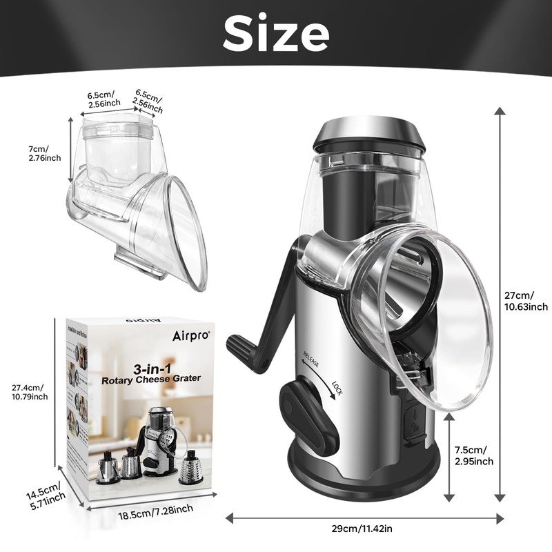 Airpro Rotary Cheese Grater with Handle, Vegetable Shredder, 3 Blades